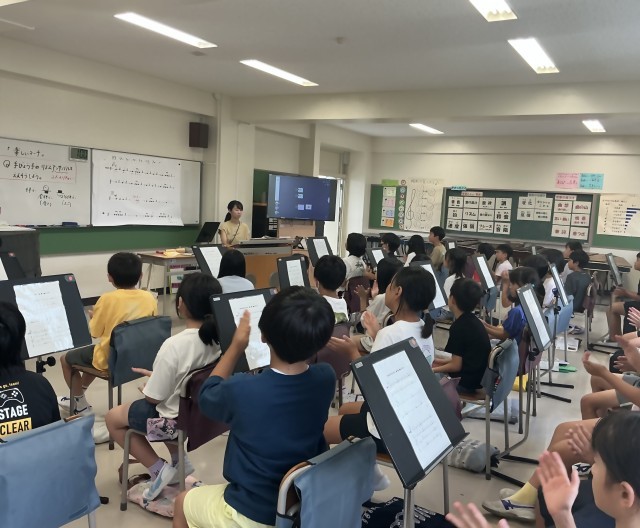 4年生は久しぶりの音楽室での学習です。クラスの友だちと息と合わせ拍打ちに楽しそうに取り組んでいました。少しずつ難易度を上げていく活動に取り組みますが、子どもたちの表情は達成感でいっぱいでした。