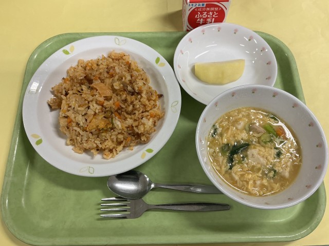 今日の献立はキムチチャーハン、卵とコーンの中華スープ、りんご、牛乳
