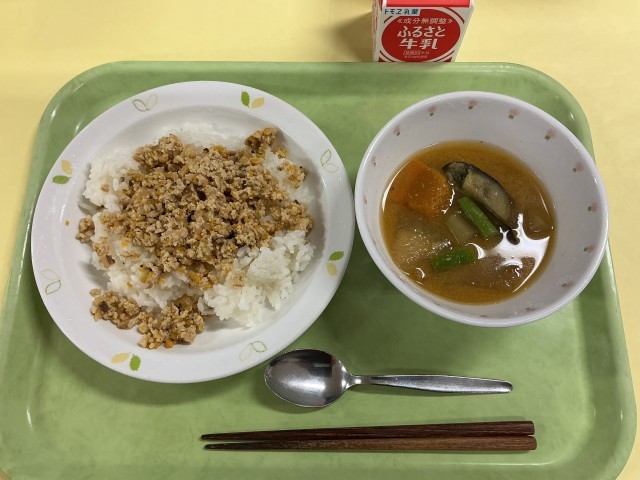 ふわふわそぼろどん 夏野菜のみそ汁 牛乳
