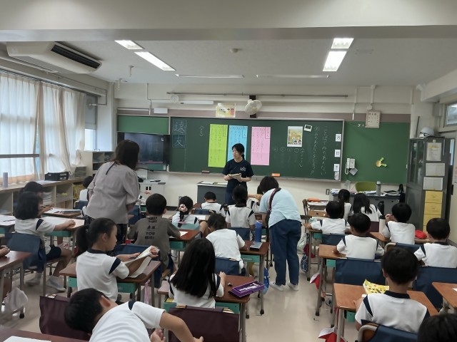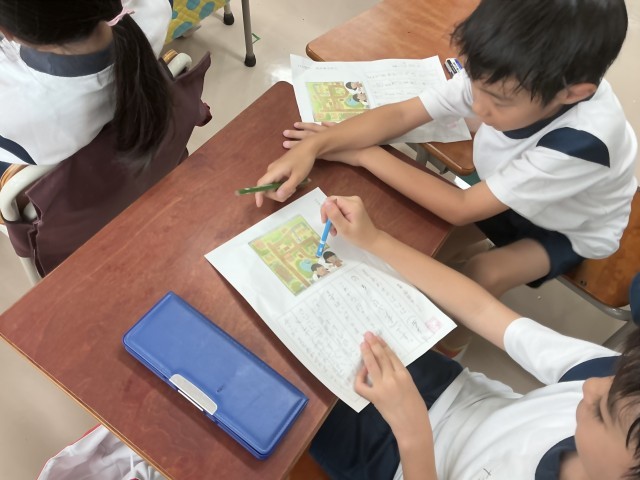 2年生は、国語の学習でメモをとりながら話を聞き目的地に辿り着く活動を行なっていました。「はじめに」「まず」「2つ目に」など聞き上手ポイントの言葉を使って班の友だちに伝え合っていました。メモも短くとれていて感心しました。