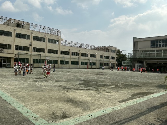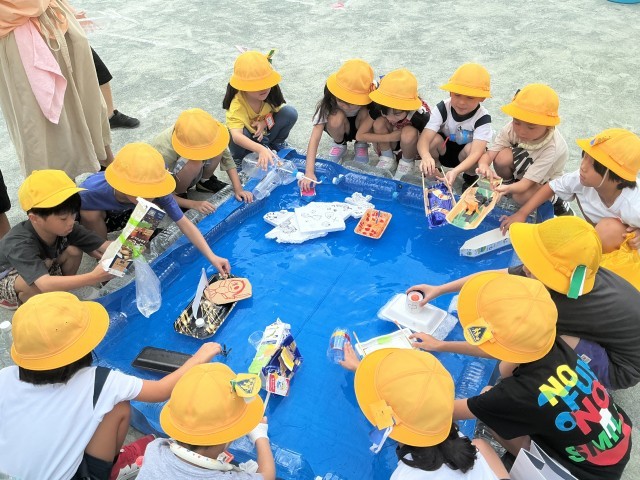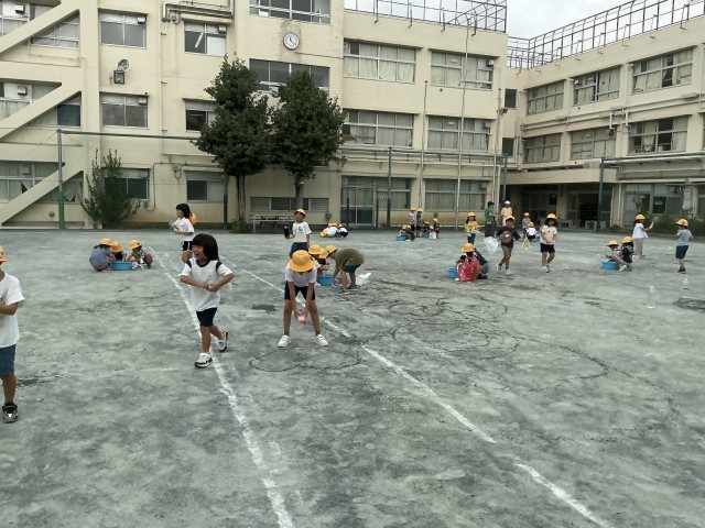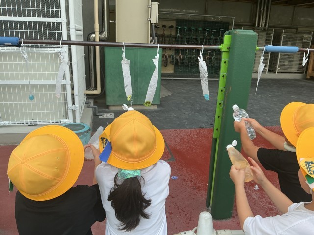 蒸し暑い中、1年生が生活科の学習で水遊びを楽しんでいました。この日のために自分たちでつくった的当てゲームや船を浮かべたりしています。