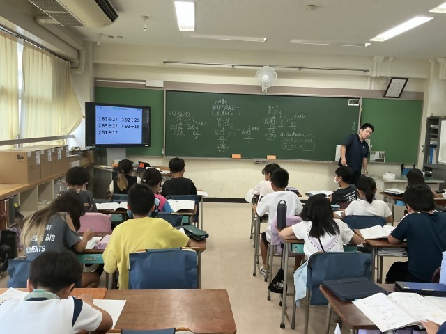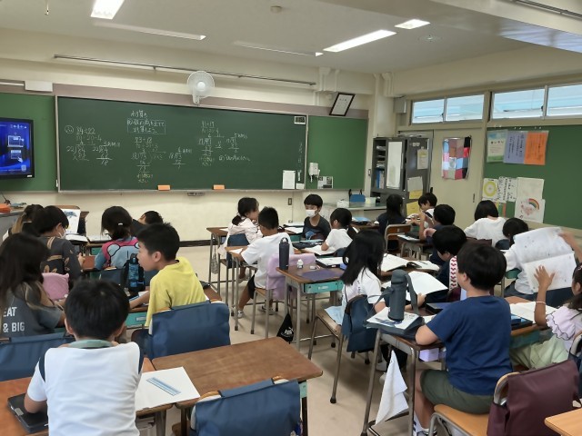 4年生が算数のわりざんの学習に取り組んでいました。仮の商を立て、あまりがわる数より大きくなるときにどうするか解いていきます。「あっ!そうか」と学習に集中しおもしろさを感じる4年生の子どもたちはとても凛々しいです。