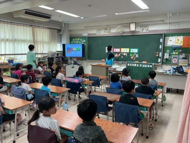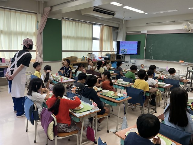 1年生教室では栄養士実習の最終日。実習生は、ミニ食育授業をし、実際にコロッケ調理にも携わりました。「コロッケ、美味しい!」と笑顔が弾けています。