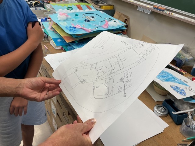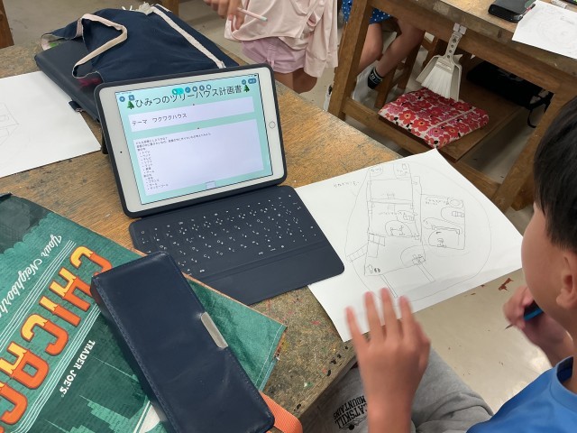 4年生は図工室で夢のツリーハウスを設計していました。子どもたちの話を聞いているととてつもなく広いツリーハウスばかりで、ワクワクします。