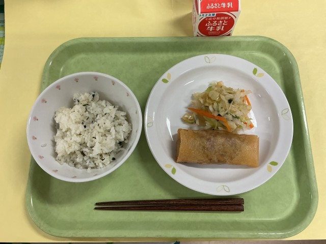わかめごはん 春巻き 中華サラダ 牛乳