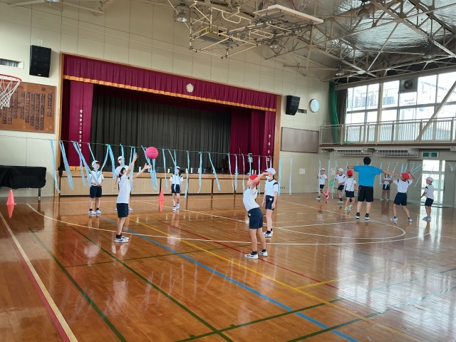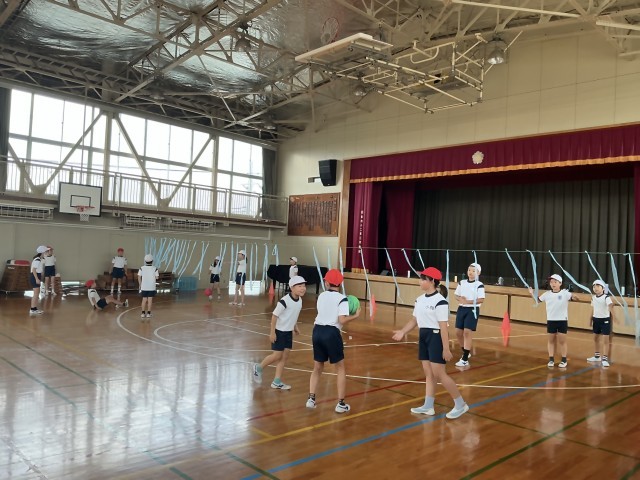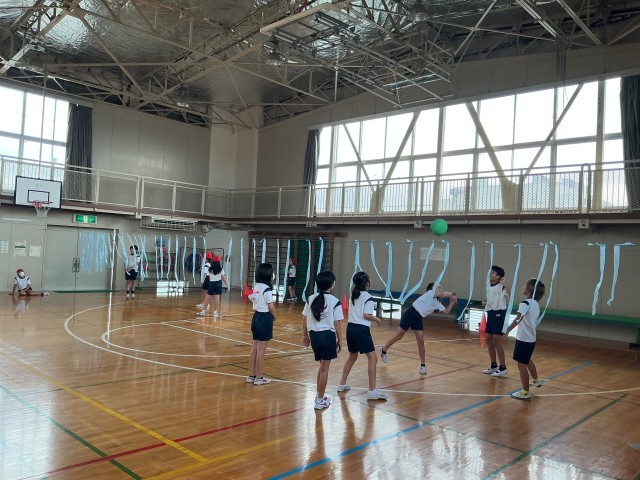 4年生は、中丸ホールで、キャッチバレーに取り組んでいました。ボール運動が苦手な子どもでも楽しくゲームに取り組めるよう工夫しています。今日はボールをキャッチし、声を掛け合いながらアタックに全員挑戦していました。ルールも自分たちが楽しくできるように話し合いながら変えていきます。