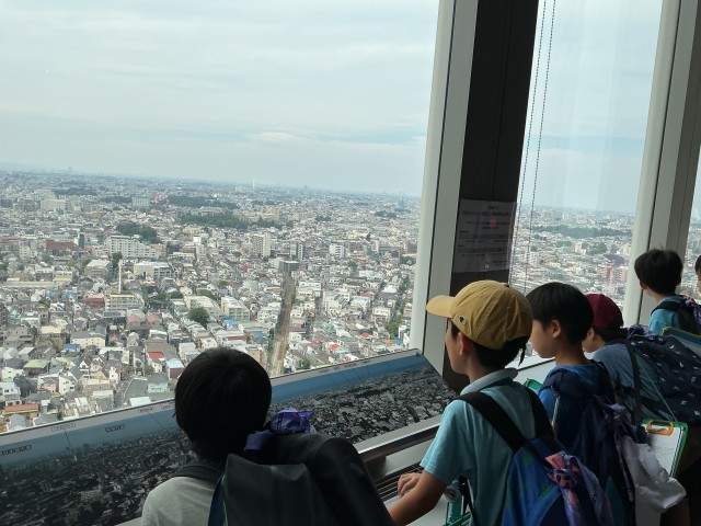 次は、世田谷線に乗り三軒茶屋駅に行き、キャロットタワー最上階から世田谷区内の様子を実際に見ました。中丸小を探そうとする子が多くうれしかったです。展望スペースからは中丸小は見られなかったですが、幹線道路、線路、公園、高層マンションなど世田谷区の特徴を見つけていました。