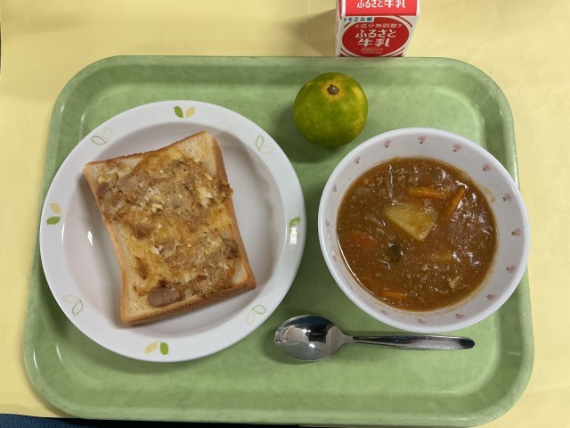 たまごとツナのトースト ハンガリアンシチュー みかん 牛乳