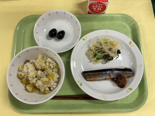 さつまいもごはん 秋刀魚のしょうが煮 菊花和え ぶどう