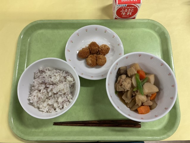ゆかりごはん 鶏肉と里芋のうま煮 月見だんご 牛乳