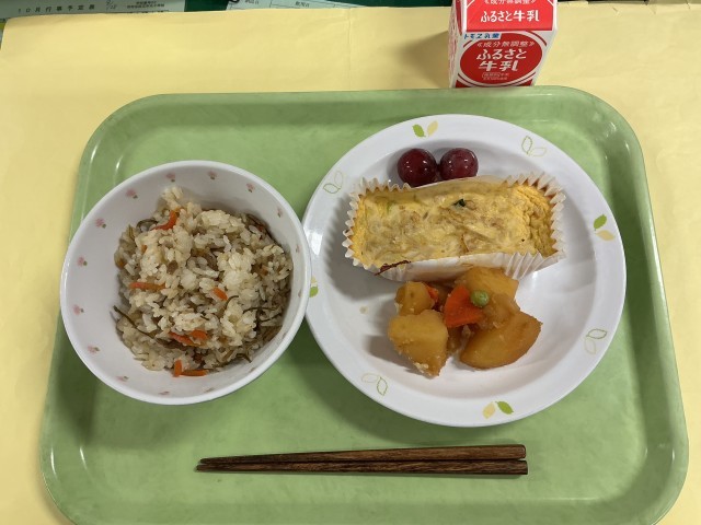 ぶた肉とごぼうのご飯 切干大根の卵焼き じゃがいもの甘辛煮 ぶどう 牛乳