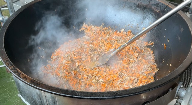 写真は、ぶた肉とごぼうのご飯の具を作っているところです。