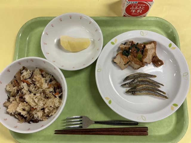 ひじきご飯 きびなごのカレー揚げ 生揚げの煮浸し りんご 牛乳