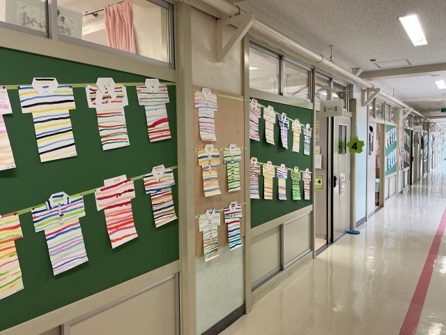 教室前廊下の掲示はどの学年もすてきです。1年教室前廊下には、カラフルな絵の具で表されたTシャツが飾られています。学校公開では、お子さんの学年だけでなく、全学年の掲示や全校児童のがんばる姿をご覧ください。