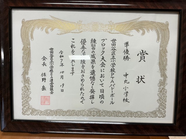 中丸小のバレーボールサークルの方が、日曜日に行われた世田谷区のバレーボール大会で準優勝なさったとうれしい報告をいただきました。おめでとうございます。表彰状は校長室前に飾ります。