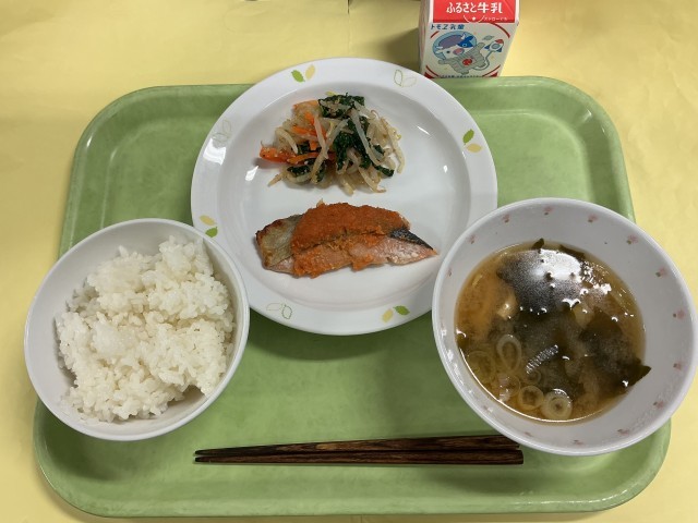 ごはん 鮭のもみじ焼き ごまあえ じゃがいもとわかめのみそ汁 牛乳