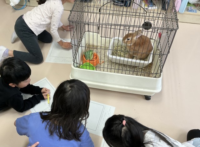 国語の「しらせたいな、見せたいな」の活動で、ムギちゃんが教室に来てくれました。近くで見ることができ、目や耳、足の形など、細かいところまで観察できました。おうちの人に知らせるために、ムギちゃんの紹介文を書く活動を頑張っています!