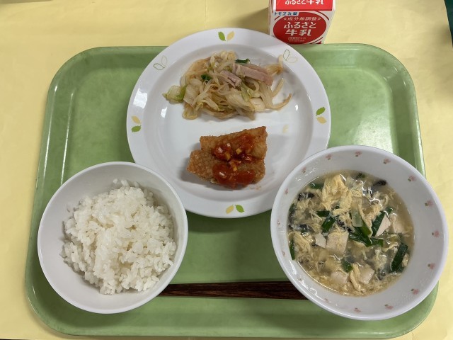 ごはん いかのチリソース 白菜の中華サラダ にらたまスープ 牛乳