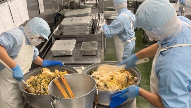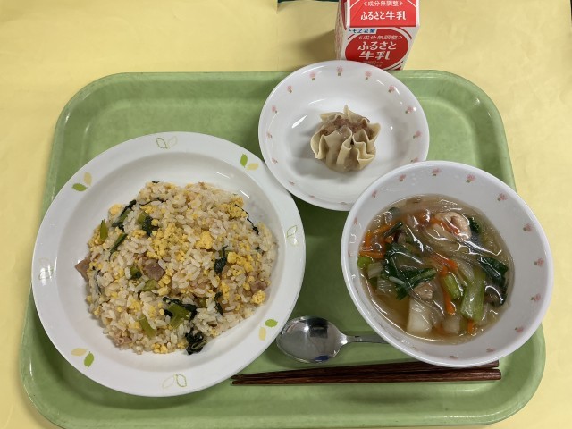 青菜のチャーハン ジャンボシュウマイ 白菜と春雨のスープ 牛乳
