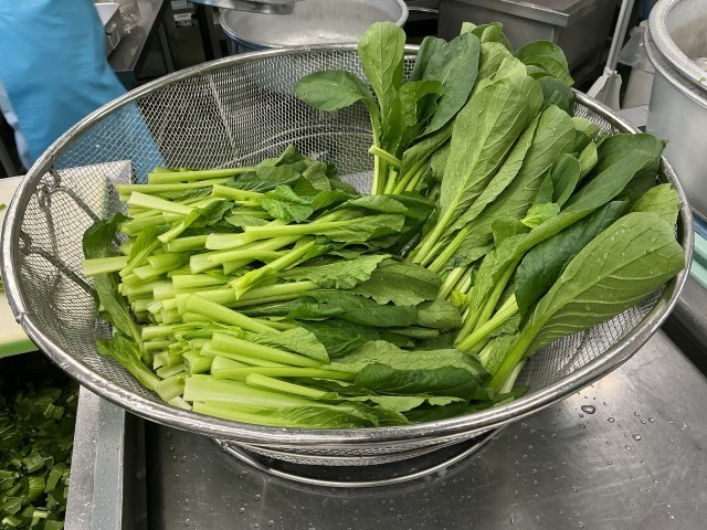 今が旬の小松菜を使って青菜のチャーハンを作りました。