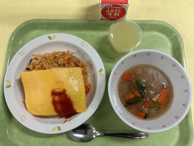 オムライス コンソメスープ りんごゼリー 牛乳