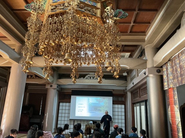 総合的な学習の時間で、地域のお宝として子どもたちは、下馬図書館さん、世田谷観音さん、龍雲寺さんをあげ、クラスごとに分かれ探究しています。今日は実際に龍雲寺さんにお招きされ立派な本堂で、下馬野沢地域の地名の由来や歴史を教えていただきました。