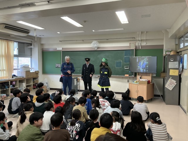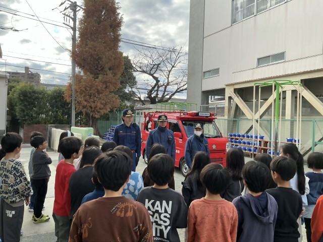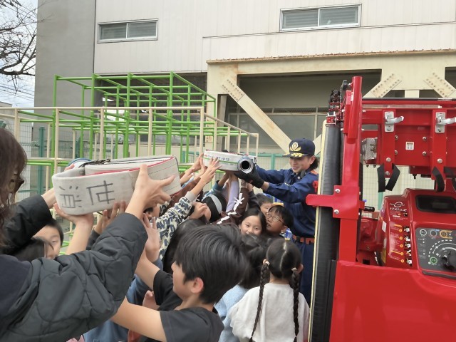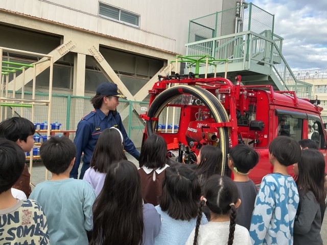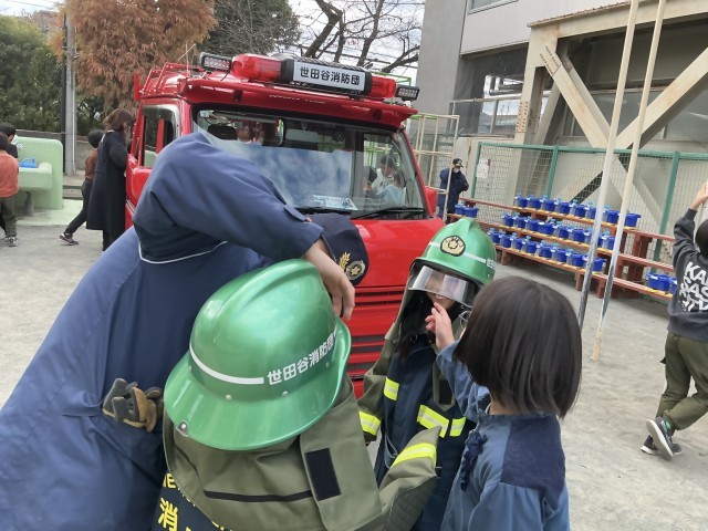 また、5時間目の社会科の学習では世田谷消防団の方からお話をしていただきました。実際にポンプ車のポンプを触ったり消防服を着させていただいたりと子どもたちは喜んでいました。