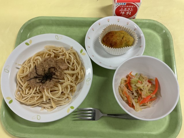 おろしスパゲッティ みそドレッシングサラダ スイートポテト 牛乳
