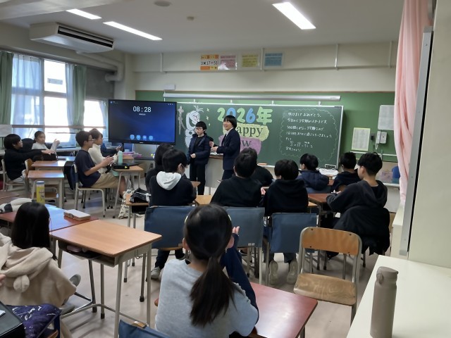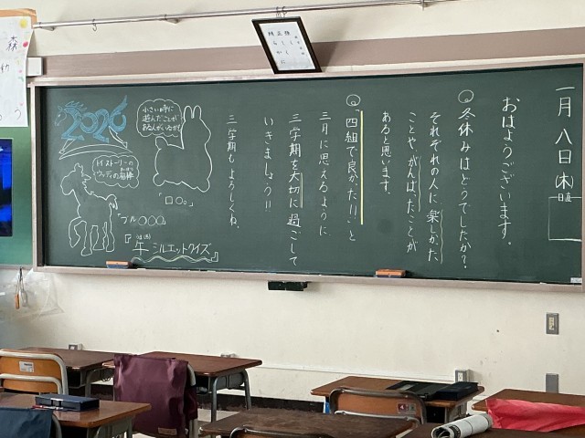 始業式で子どもたちに話しましたが、3学期は50日間と短く、友だちと協力して次の学年の「0」学期として学習や生活に取り組んでほしいです。子どもたちが自信をもって進級できるよう心がけていきます。教室の黒板には、先生方の愛にあふれたメッセージが描かれ子どもたちを迎えていました。