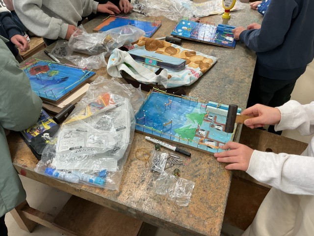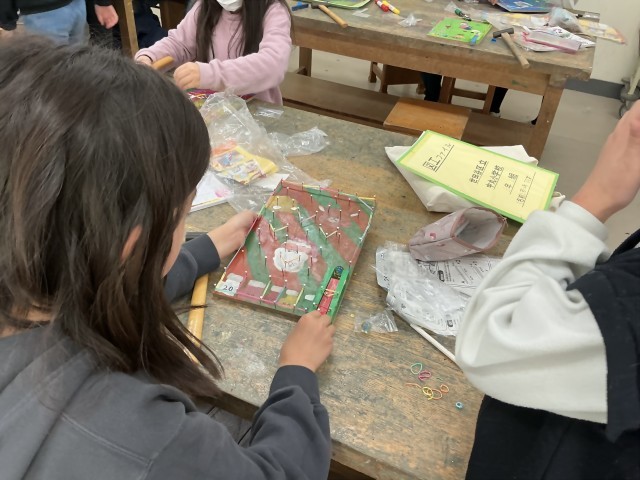 3年生は、普段は教室での図工ですが、金づちを使って制作するので図工室で行なっていました。子どもたちがくぎをまっすぐに打てているので、ビー玉がスムーズに動きます。作り終えた子どもたち同士でパチンコゲームを楽しんでいました。