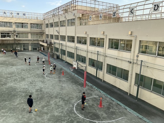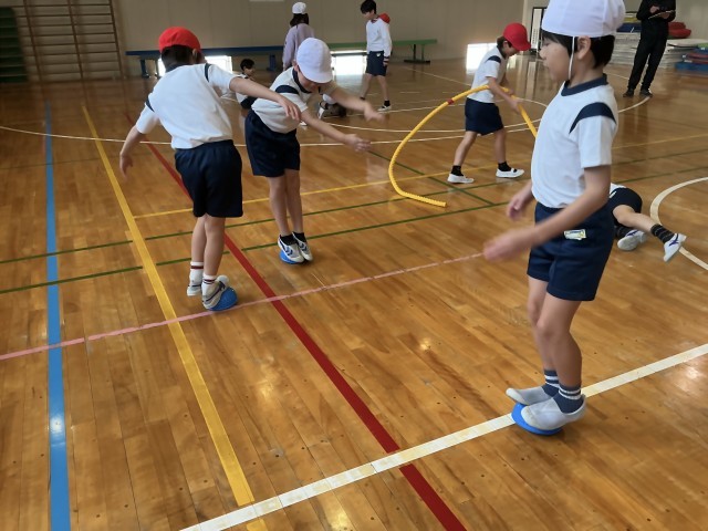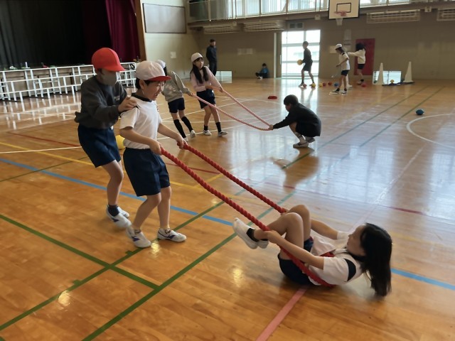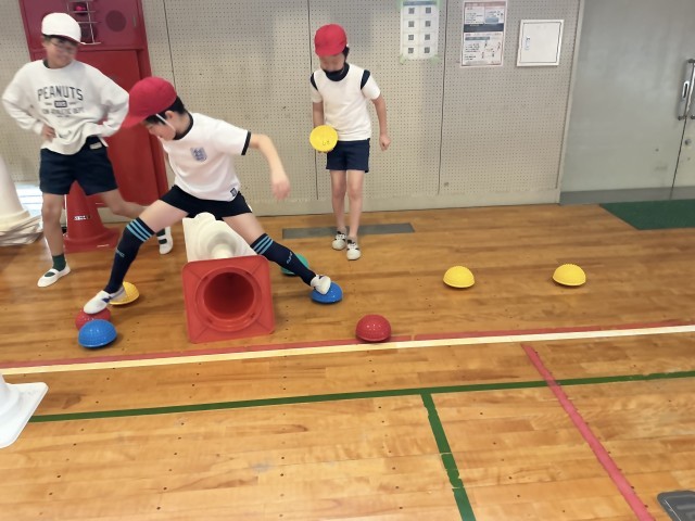 4年生は、カラーコーンとペットボトルを使ったテイーボールセットをグループごとに用意し、子どもたちのバットを持つ時間を増やしています。中丸小では子どもたちの体づくりのために、体育用具を工夫して作ったり予算の中で購入したりしています。中丸ホールでは、4年生の別のクラスの子どもたちが、コーデイネーショントレーニングで準備運動した後、カラーロープやバランスマーカーを使った多様な動きにグループごとに考え取り組んでいました。