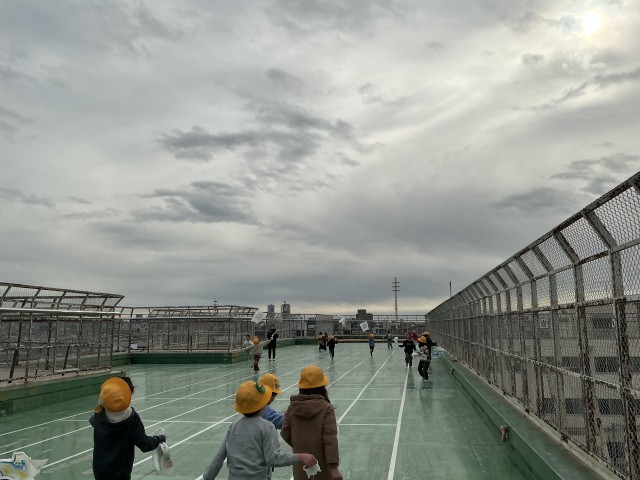 冷たい風が吹いていましたが、1年生は屋上で凧あげに取り組んでいました。先日、図工の時間に作ったグニャグニャだこのお披露目です。風に乗って高く上がっていました。