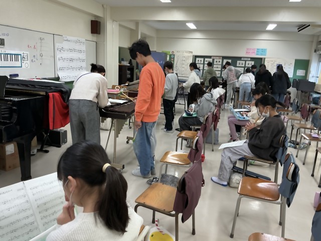 6年生は音楽室で合奏練習を行なっていました。今、取り組んでいる曲が小学校最後の合奏曲になります。在校生や先生方に聞いてもらうので、熱心に練習に取り組んでいきます。