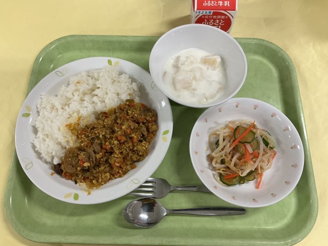 ドラカレーライス こんにゃくサラダ フルーツヨーグルト 牛乳