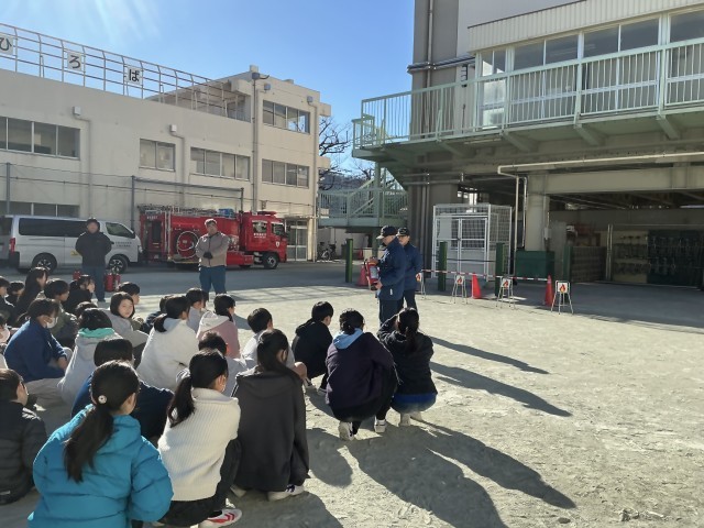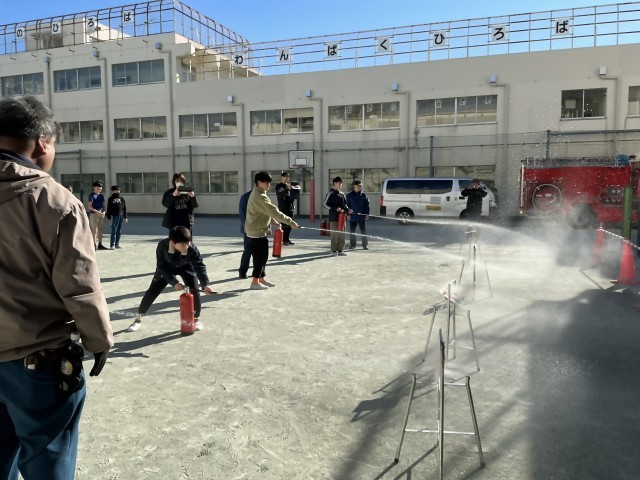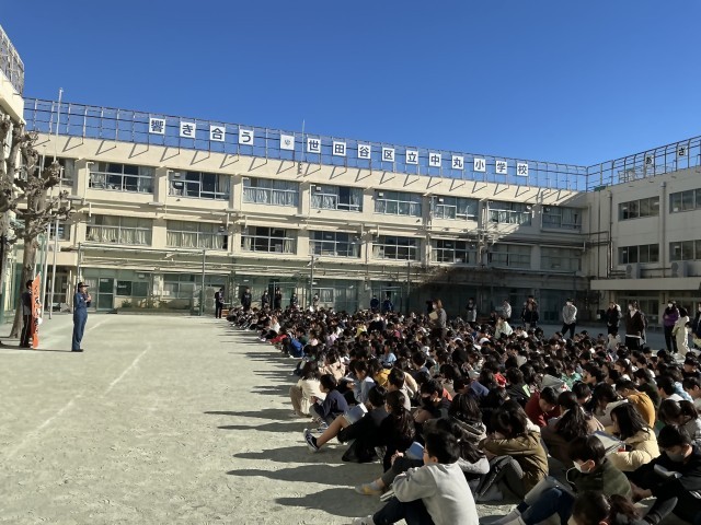 6年生は、世田谷消防署三宿出張所の消防士さんから消火器の使い方を教えていただき、消火体験を行いました。火が小さいうちに周りに出火があることを大声で知らせ、火元から2mほどの所で消火器を使います。10秒ほどで消火器の中の消火剤がなくなるので、火元近くで消火器を使うことを体験しました。4月からは中学生になる子どもたち。地域防災の担い手として活躍を期待しています。