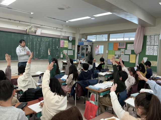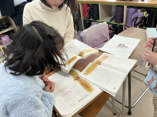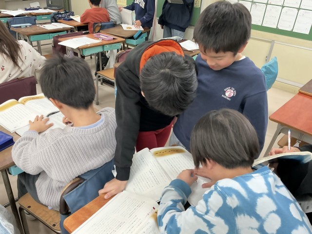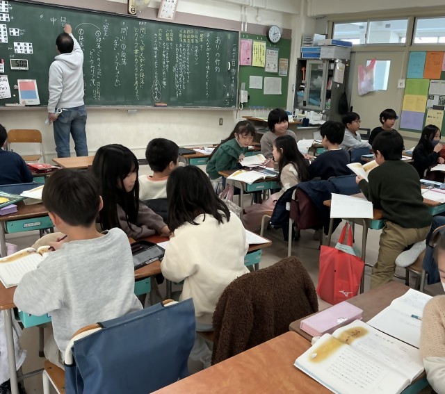 3年生は、国語の学習で説明文から中心となる問いと答えがどの段落でどのように書かれているか見つけ出していました。これまでの説明文の学習の積み重ねで、文章の構成を考えたり、手がかりになる言葉を見つけたりすることが定着しています。ありが行列をつくる理由を動物学者が調べた実験内容の説明文ですが、子どもたちは「どんな特別なにおいなんだろう」「どうして特別な液は蒸発するんだろう」と興味津々です。学習課題は自分一人でも友だちと一緒でも考えていいのですが、決めるのは子ども自身です。笑顔が絶えない安心できる教室で自分なりの解決方法と見通しをもって学習課題に取り組んでいました。45分間、前のめりになって考え続ける中丸の3年生です。