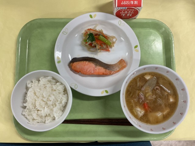 ごはん 鮭の塩焼き おひたし 根菜汁 牛乳