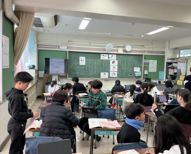 4年生は、道徳の学習に取り組んでいました。日常生活でもありがちな、「人によって言動を変える」ことについて意見を発表していました。教材文には、長縄で失敗した男子には「ドンマイ」と言うけど、女子の失敗には非難する子の話と、指がケガしているからと糊で貼る作業を止められる子の話が登場してきます。「あるある」と子どもたちは自分ごとにして考え、「難しいなあ」と言いながらも、「絶対、人によって態度を変えるのはよくない」「同じ言葉でも言い方を変えてくれれば聞いてくれる」「差別はよくないけど、困っている人を助けることになるなら態度を変えた方がいい」「時と場合による」などと友だちと話し合った後、クラス全体で意見交流をしました。自分の考えを授業の前後で比較できるように視覚的に工夫した簡単スケールを使って友だちと共有できていました。「よく考えたからお腹空いた!」がんばった4年生です。