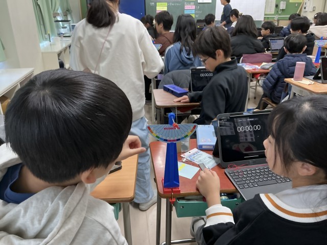 5年生は、ペアで振り子の実験に取り組んでいました。振れ幅やひもの長さ、振り子の重さなどいくつかの条件のうち、変えるものと変えないものを分け実験を行います。今日は、ひもの長さ以外は変えずに、ひもの長さを10cmから50cmに変えて10往復した時間を測定しました。ペアで行うので協力し合わないと測定できません。測定結果はシールで大きなグラフ用紙に貼り共有します。