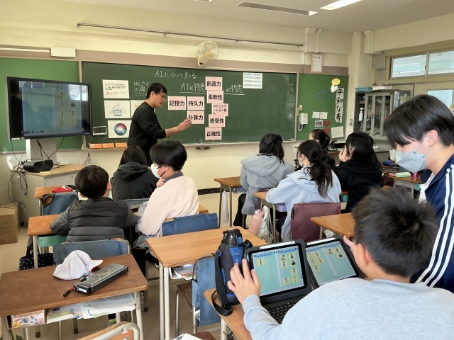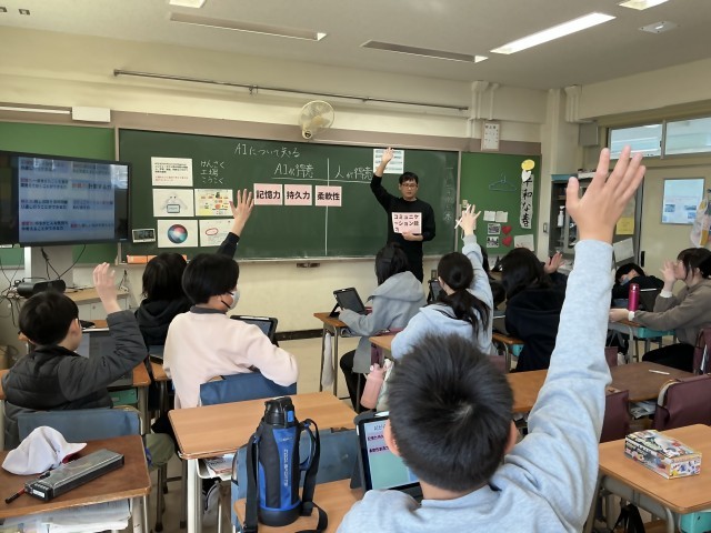 6年生の別のクラスでは、生成AIについて学んでいました。今では生活に欠かせない生成AIですが、これからどうなるか、どう付き合っていくとよいのか考えていきます。生成AIだけで作った動画を見たあと、8つの力のうち、人間が生成AIに勝てそうな力、10年後に残っている職業などについて話し合いました。「コミュニケーション力だけは、人間の方がAIより勝てそう」「いや、もうAIに全敗でしょ」と毎日の生活を振り返りながら話し合います。「AIのデザインは魅力的じゃない」「お医者さんや先生は人間の方が信頼できる」と言っていましたが、A Iはどんどん進化します。活用できるものは活用した方がいいという意見にまとまりました。