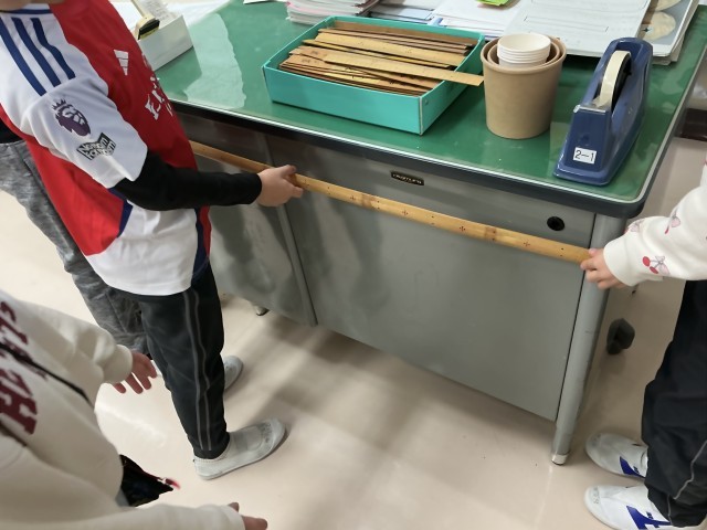 2年生は、「m」という長い長さの単位を学習しました。ただ、1mを量感として感じていないので、今日は教室の中にある1mを予想して測りました。「妹の身長が102cm」という子はやはり1mの長さを量感として分かっていました。教卓の横の長さや後ろの黒板の縦の長さがピッタリ1mなことを見つけたときは歓声が起きました。楽しみながら1mの長さを実感できました。