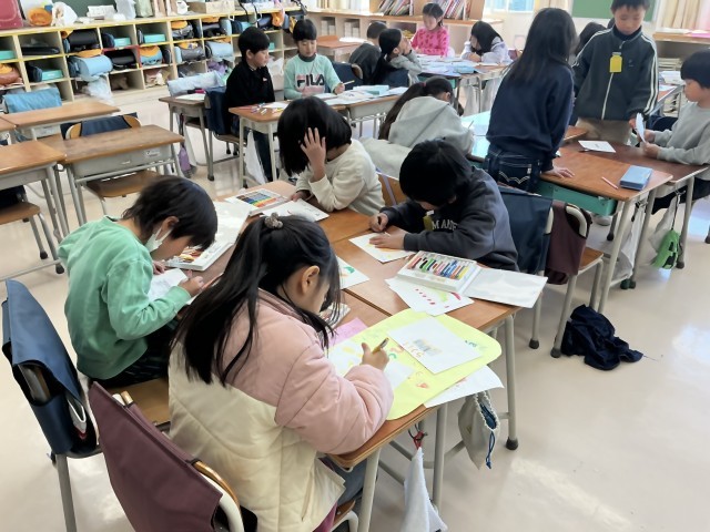 6年生の子どもたちは、久しぶりに会う友だちと楽しそうに過ごしています。その6年生に向けて下学年の子どもたちは代表委員が中心になってサプライズを企画しています。お世話になった6年生の顔を思い出しながらメッセージを書いています。