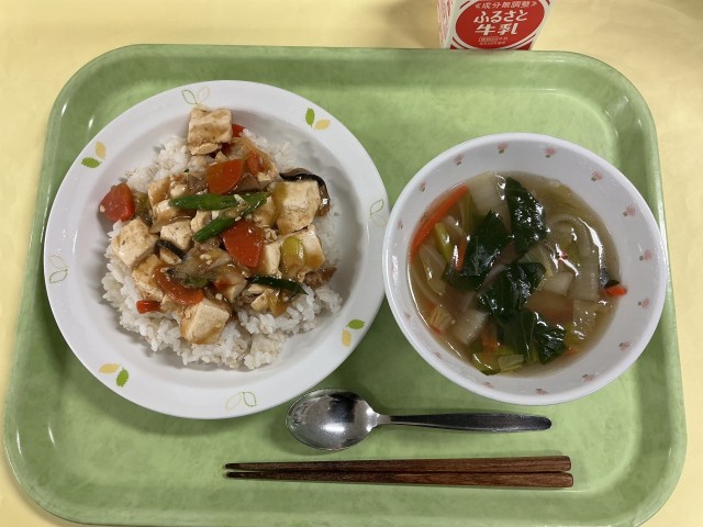 四川豆腐丼 白菜と春雨のスープ 牛乳