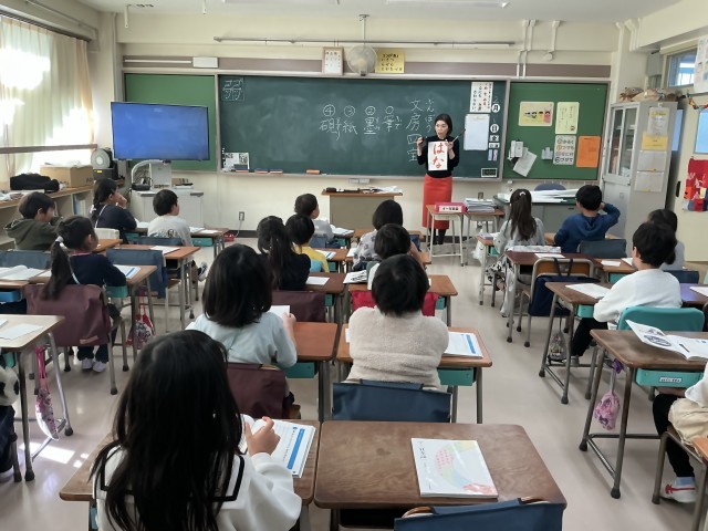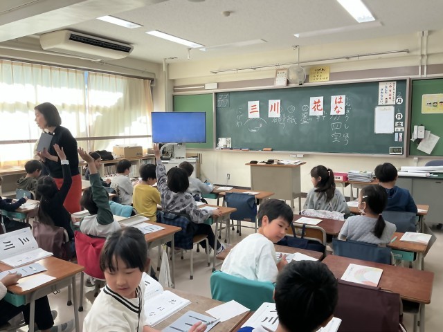 2年生は書道教室の先生から出前授業を受けていました。姿勢を正して水筆で書きます。大きくのびのびと書き上げ満足げな子どもたちです。