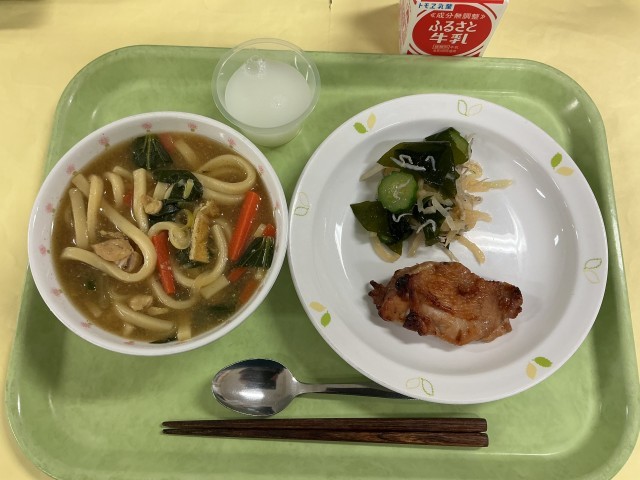 カレーうどん 鶏肉のレモン醤油焼き じゃこサラダ カルピスゼリー 牛乳