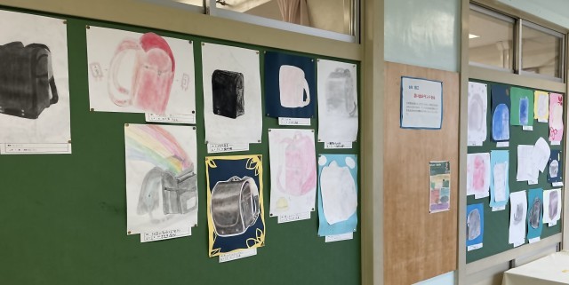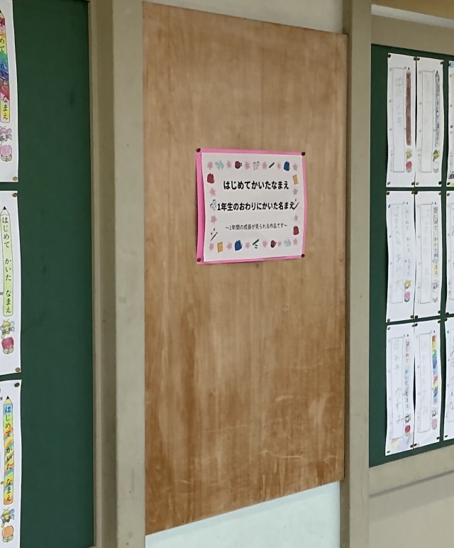それぞれの教室前廊下には今年度最後の学習のまとめを掲示しています。1年生は、4月に書いた自分の名前と見比べられるようにしています。字画が整い、筆圧も高く、漢字も使って書き取れるようになりました。