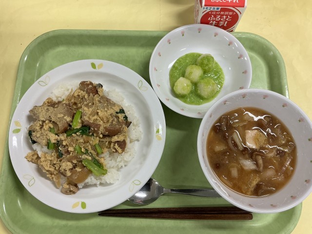 油麩の卵とじ丼 白菜となめこのみそ汁 ずんだだんご 牛乳
