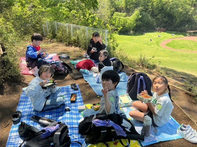 こどもゆうぼくじょうまで歩いて、お家の人が作ってくださった美味しいお弁当をもりもり食べました。