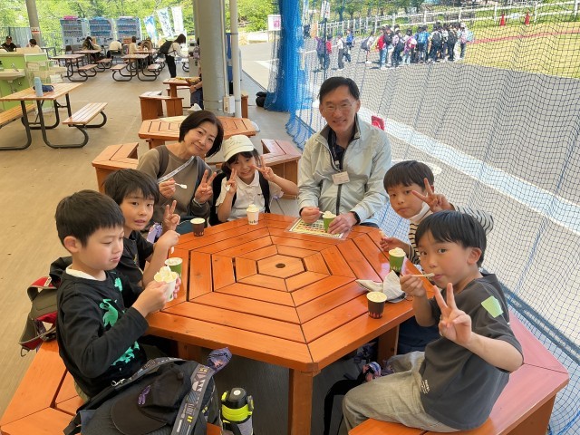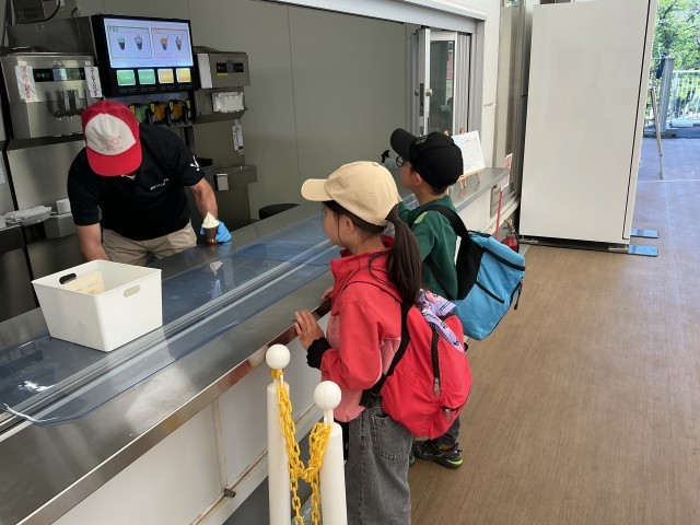 午後は、美味しいソフトクリームやアイシーを食べたり、ウシとヒツジの牧場で牛や羊を見学したりしました。