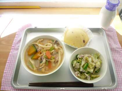 今日の献立は、ほうとう、甘納豆入り蒸しパン、ゆかりあえ、牛乳です。